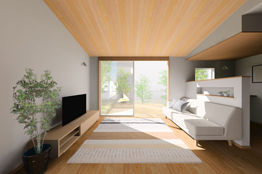 空間のゆとりを生かした開放的な空間と緑や風を感じながらゆったりと暮らすことができることを考えています。